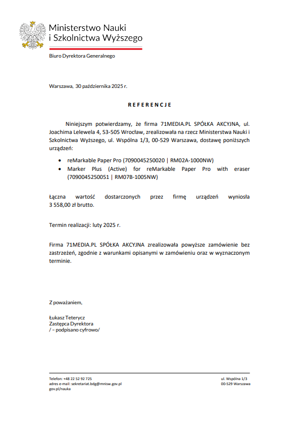 "Niniejszym zaświadczam, że Ministerstwo Finansów zleciło w maju 2018 r. firmie 71 media.pl S.A (Czytio.pl), z siedzibą przy ul. Lelewela 4, 53-505 Wrocław dostawę 10 czytników Kindle Paperwhite 3 wraz z etui.