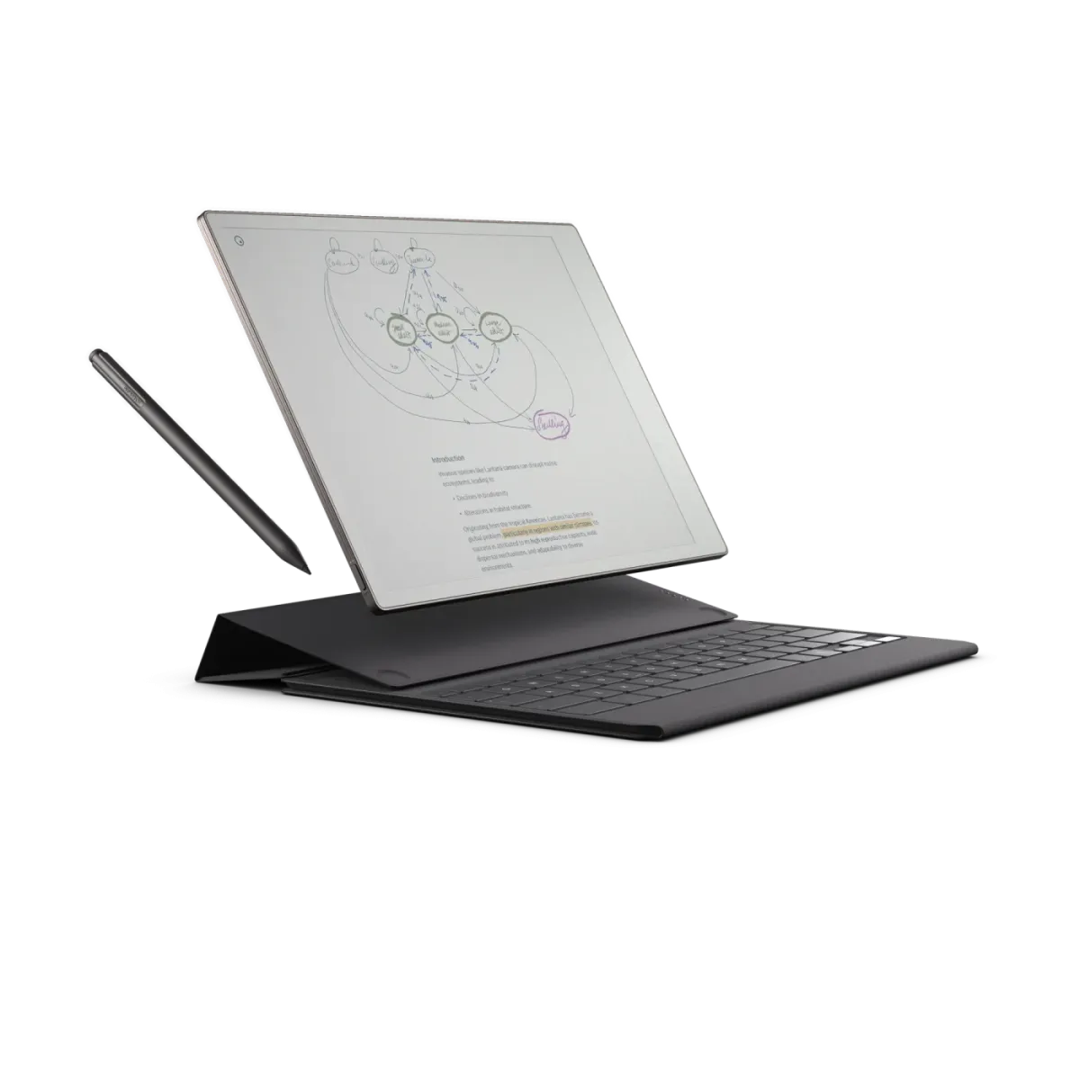 Konstrukcja etui umożliwia ustawienie ekranu w pozycji wygodnej do pisania na klawiaturze lub obniżenie go, aby swobodnie przejść do notowania odręcznego. Zmiana ułożenia czytnika w etui pozwala także schować klawiaturę, gdy nie jest potrzebna