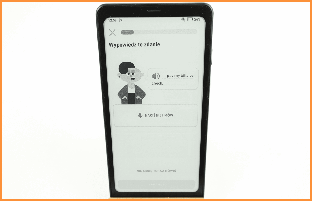 Duolingo na Onyx Boox Palma 2 działa płynnie i czytelnie: interfejs dobrze wygląda na ekranie E Ink, elementy są wyraźne, a przejścia między zadaniami nie „rwą” rytmu nauki. Ćwiczenia odsłuchowe i powtarzanie zdań wypadają bardzo dobrze — podwójne głośniki brzmią klarownie, a mikrofon bez problemu łapie wymowę. W praktyce wystarczy lekko zwiększyć czcionkę w aplikacji i włączyć ciepłą barwę podświetlenia, by oczy mniej się męczyły podczas wieczornych sesji. Jeśli pojawią się drobne „duchy” obrazu typowe dla E Ink, szybkie odświeżenie ekranu lub ustawienie trybu wydajności w Palmie 2 przywraca idealną czytelność. Efekt końcowy? Lekcje idą gładko, bez rozpraszaczy znanych ze smartfona, a tempo nauki pozostaje wysokie.