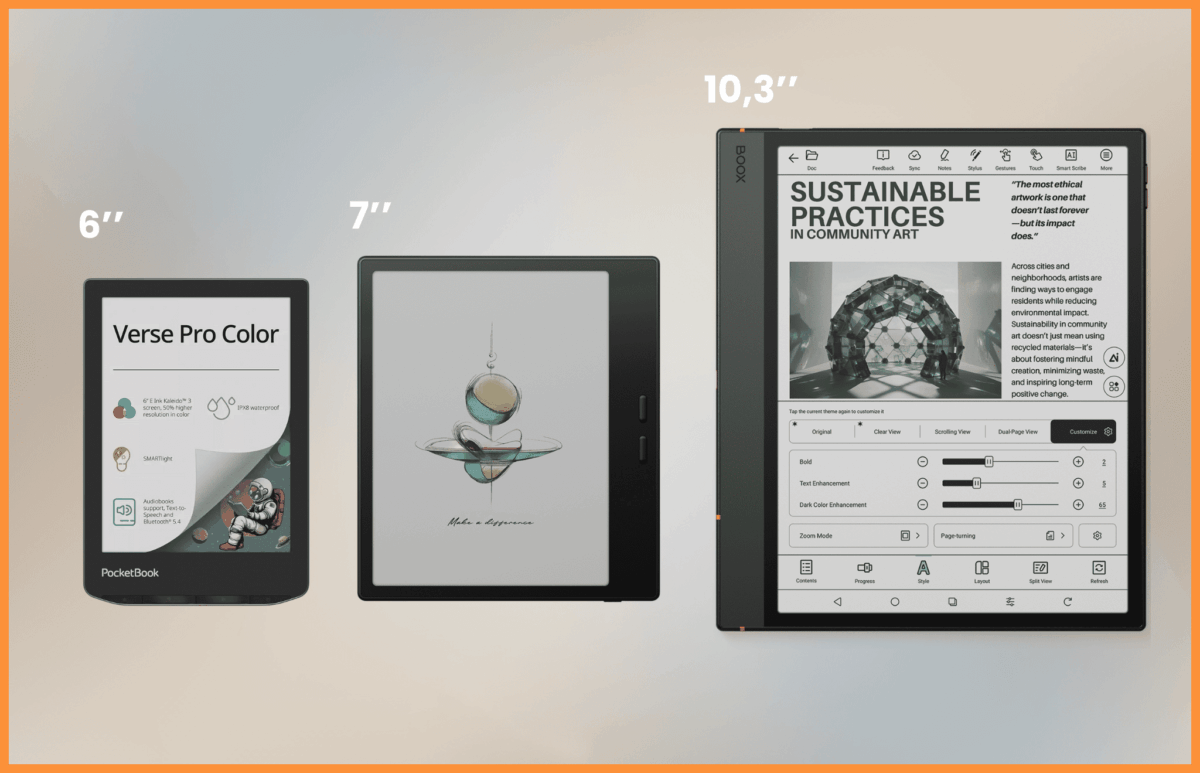 7 cali to najbardziej uniwersalny rozmiar. Większy ekran poprawia komfort czytania i przeglądania treści, a jednocześnie czytnik nadal pozostaje mobilny. To dobry prezent świąteczny dla osób, które chcą czegoś więcej niż klasyczne 6 cali, ale nie potrzebują dużego tabletu E Ink.