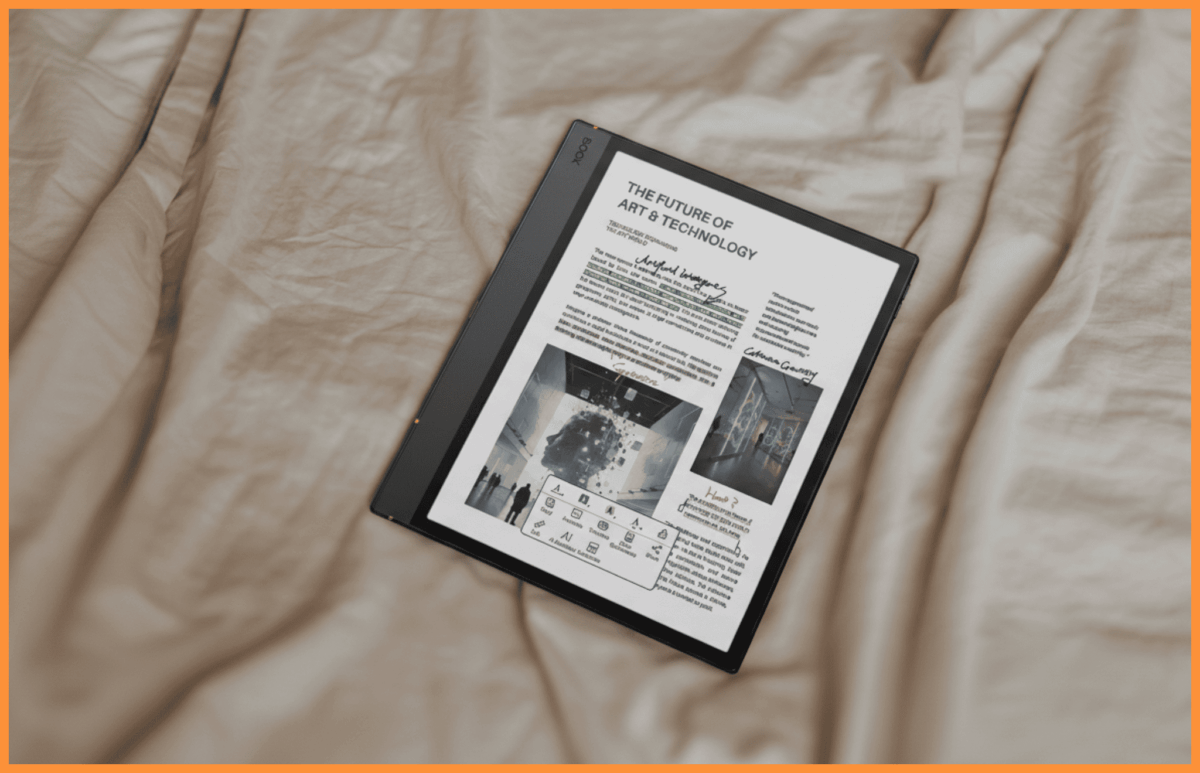 Wyświetlacz 10,3″ E Ink Kaleido 3 łączy komfort czytania z możliwością pracy z kolorem. Tekst pozostaje wyraźny, a grafiki, schematy i notatki z akcentami barw wyglądają naturalnie. Regulowane podświetlenie z ciepłą i zimną barwą pozwala dopasować ekran do warunków – od biura po wieczorne czytanie. Tryby odświeżania pomagają dobrać balans między płynnością a ostrością, co w praktyce ułatwia przeglądanie PDF-ów, notowanie i korzystanie z aplikacji.
