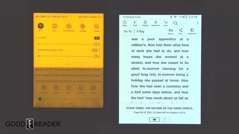 Czytnik Kindle wyróżnia się, ze względu na wgraną funkcję X-Ray. Po jej wybraniu znajdziemy informacje związane z czytaną książką (wzmianki o postaciach występujących w książce, miejscach zdarzeń czy samych aktywnościach bohaterów). Czytniki PocketBooka nie mają takiej funkcji.
