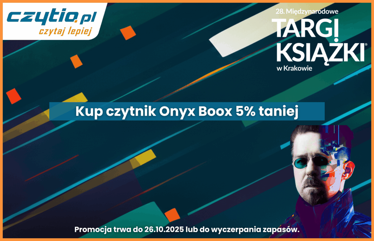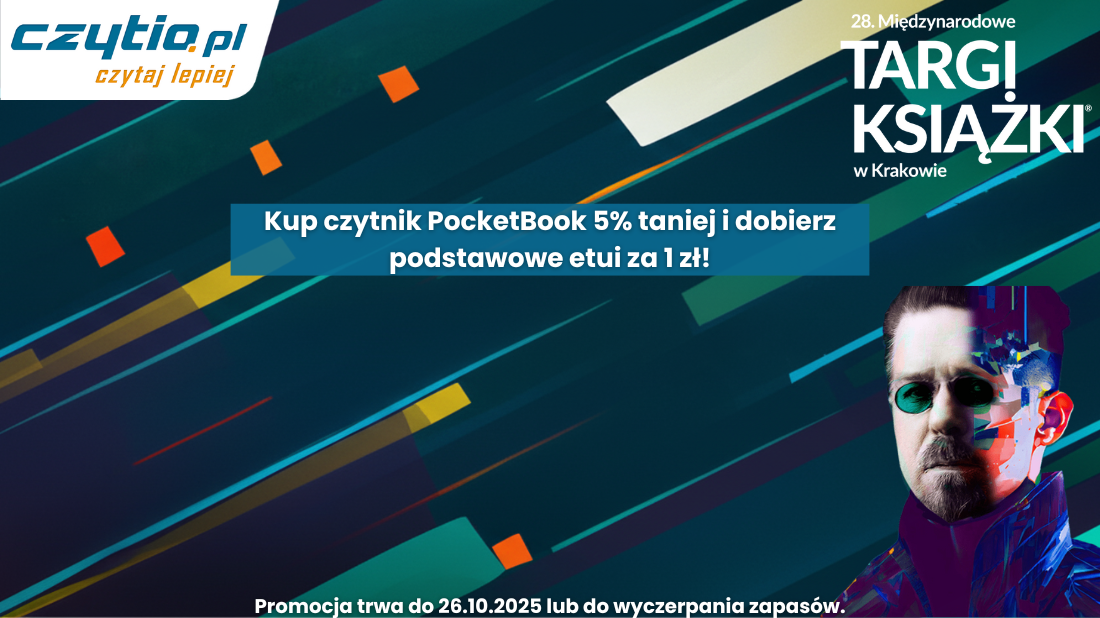 Promocja obejmuje 5% rabatu na czytniki PocketBook i Onyx Boox, z tym że: PocketBook – na stoisku D2 podczas Targów Książki w Krakowie i online na Czytio.pl, a Onyx Boox –wyłącznie online na Czytio.pl. Dodatkowo, przy zakupie czytnika PocketBook dobierzesz standardowe etui za 1 zł. Oferta obowiązuje od 22.10–26.10 lub do wyczerpania zapasów.