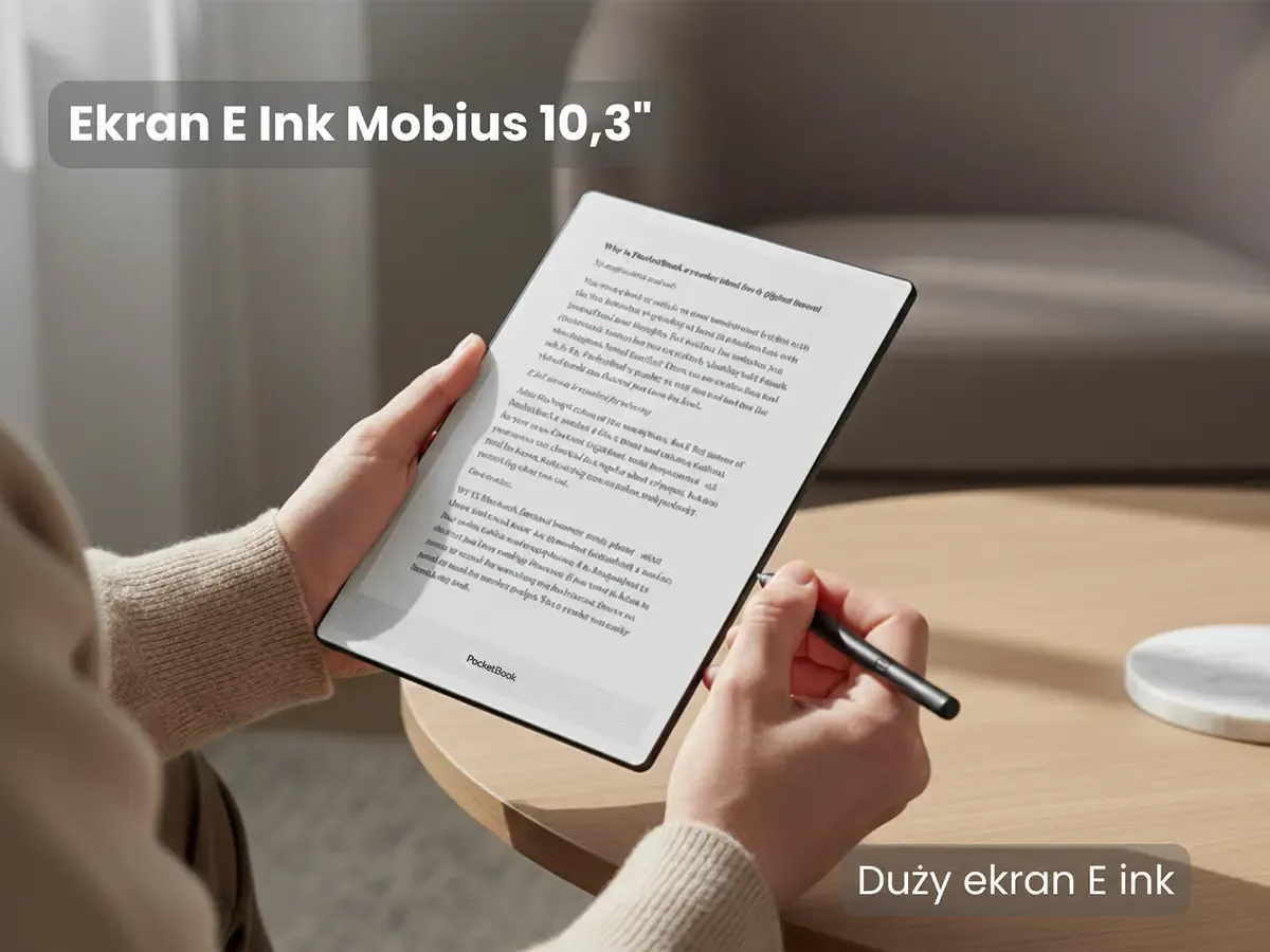 PocketBook InkPad One oferuje duży, 10,3-calowy czarno-biały ekran E Ink Mobius z przednim podświetleniem, którego format i powierzchnia są zbliżone do strony papierowej książki. Dzięki temu czytnik doskonale sprawdza się przy czytaniu literatury technicznej, magazynów oraz pracy z rozbudowanymi dokumentami PDF, gdzie liczy się przestrzeń i czytelny układ treści.