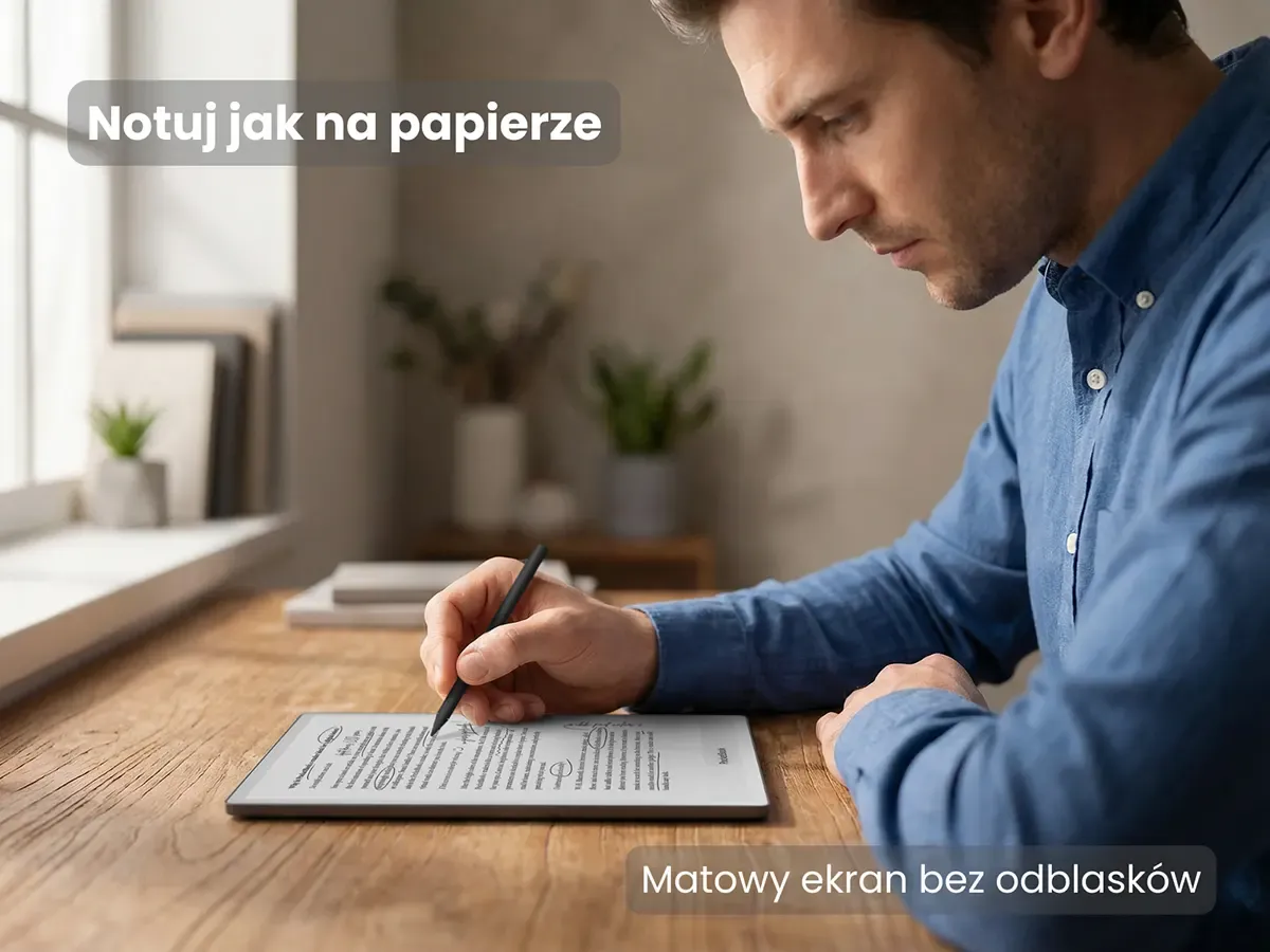 Matowa powierzchnia ogranicza odblaski, a regulowane podświetlenie pozwala dopasować jasność i barwę światła do pory dnia oraz warunków otoczenia. To rozwiązanie stworzone z myślą o długim, komfortowym czytaniu oraz pracy z wymagającymi treściami.
